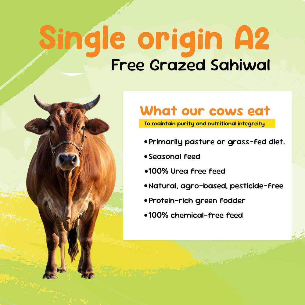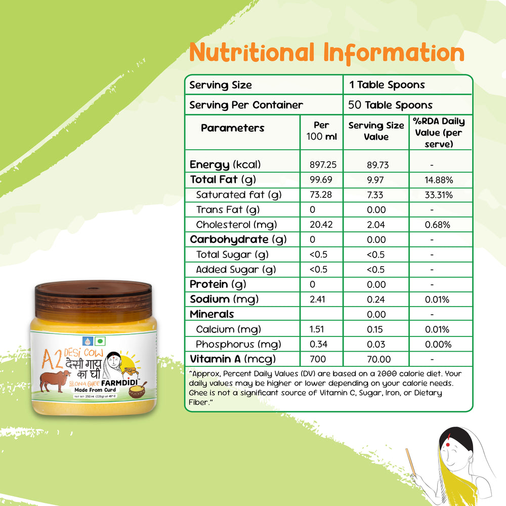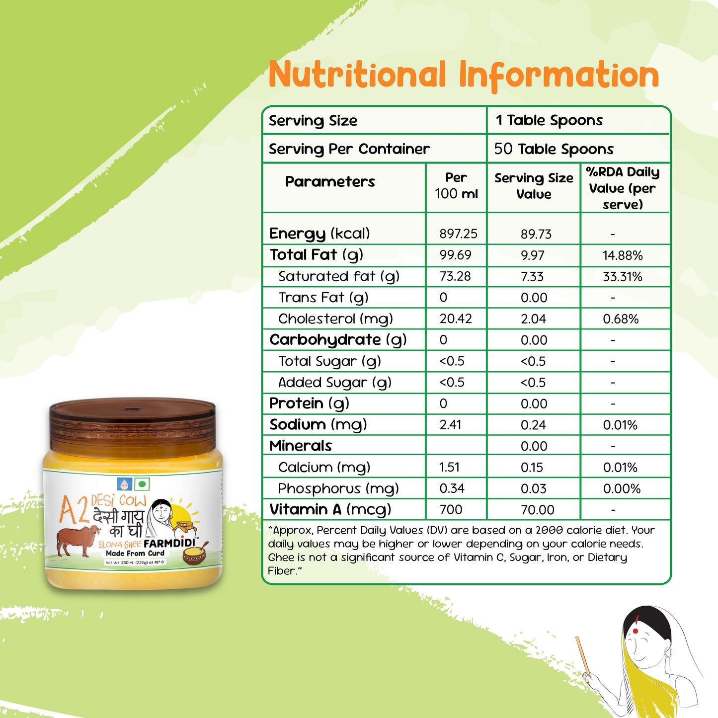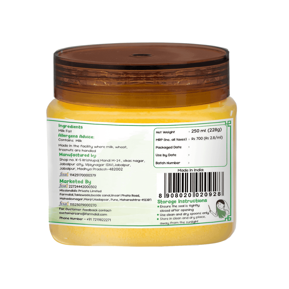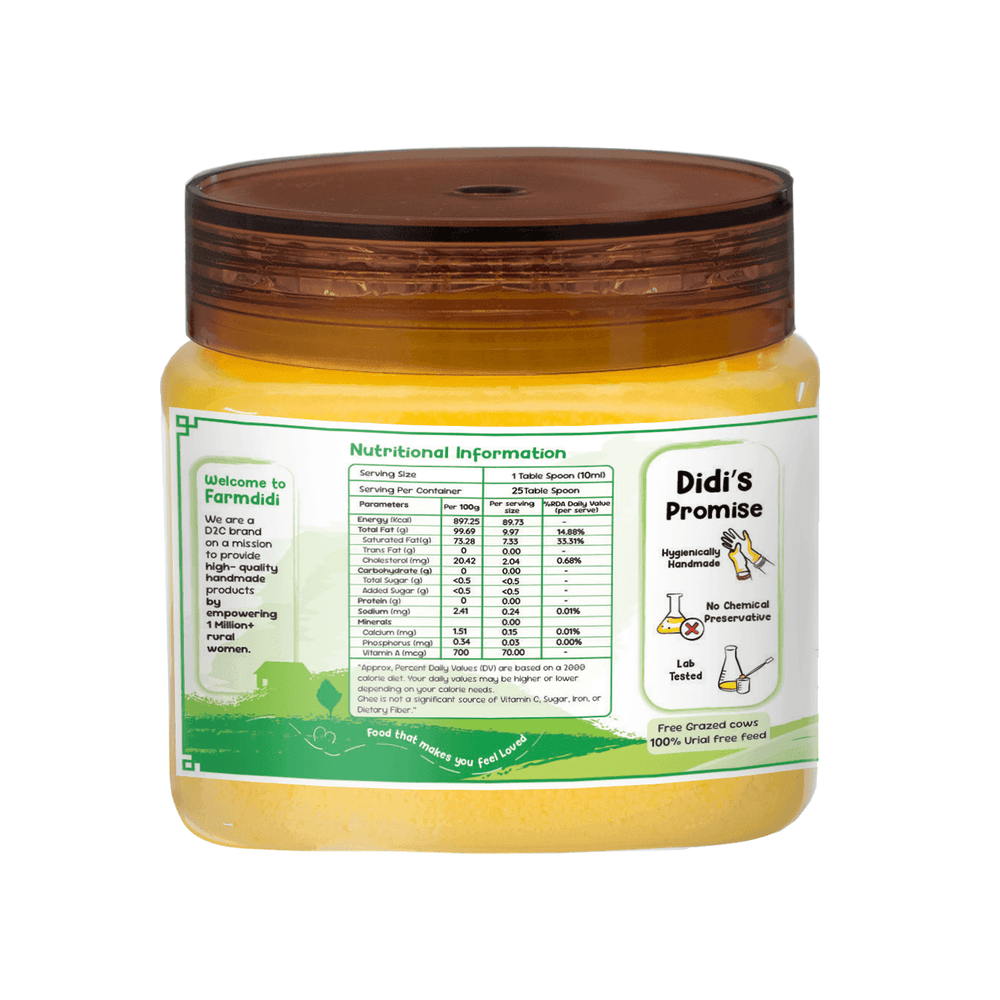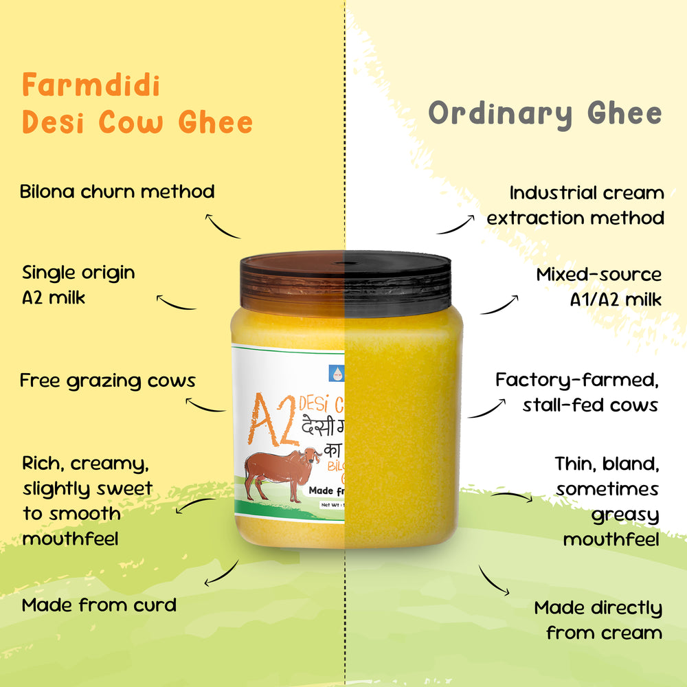 Farmdidi A2 Desi Cow Ghee is made entirely from the milk extracted from desi cows. The indigenous cow gives around 2-3 litres of milk per day which is more nutritious than foreign breeds that produce more milk. The cows are neither forced nor injected with hormones to enhance milk production. Our ghee is bi-directionally bilona churned with a wooden churner. This is why our A2 cow ghee has a grainy ure thicker consistency tempting aroma superior flavour and is much healthier. Hence A2 Desi Cow Ghee is costlier and better than regular ghee.