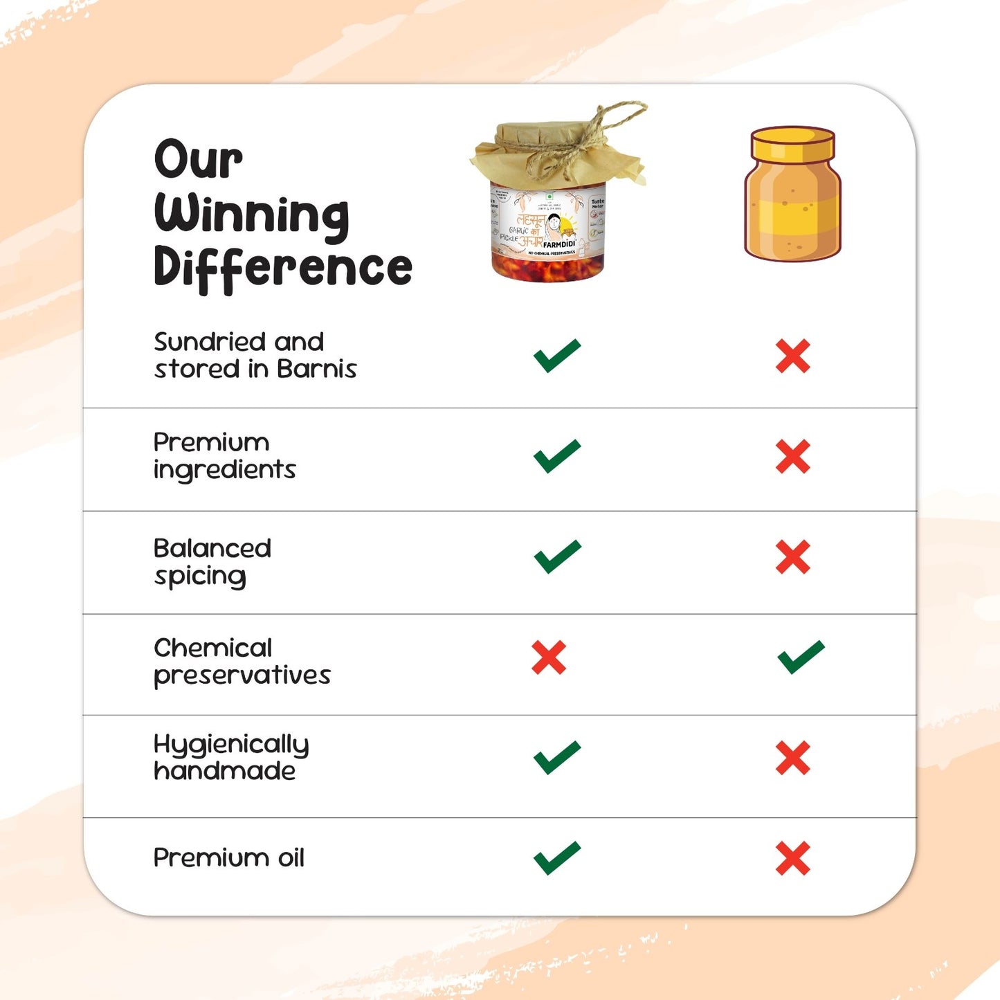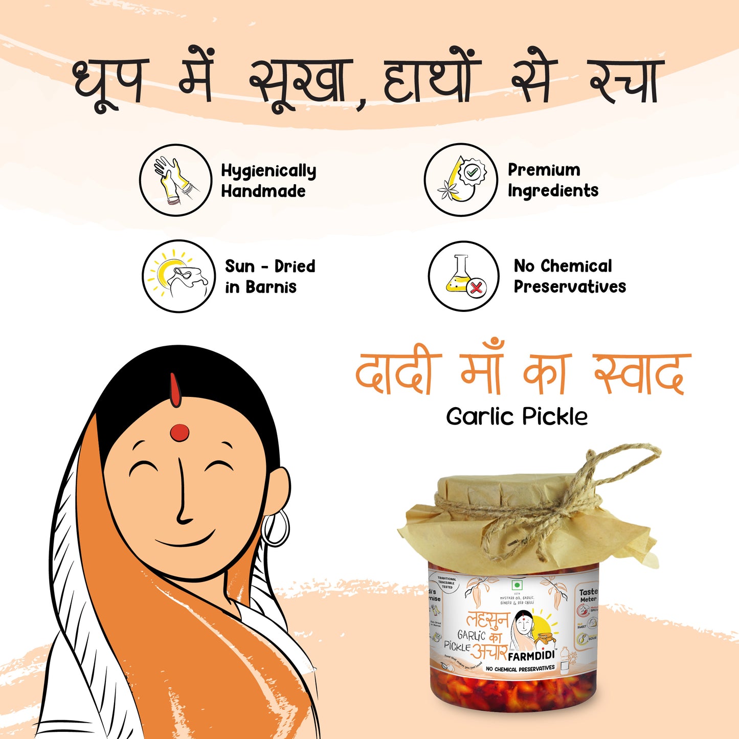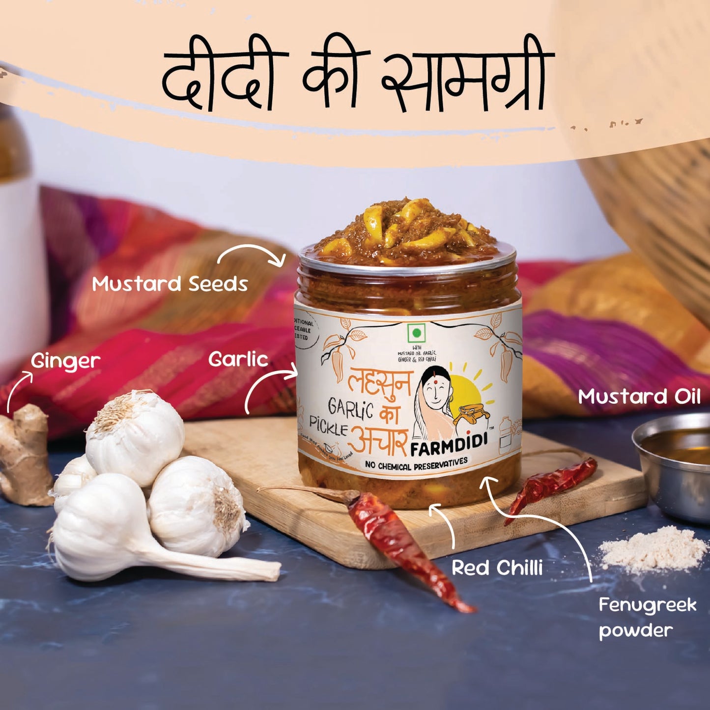 FarmDidi’s Garlic Pickle also known as lahsun ka achar is a bold and flavourful delight which is authentically made by Mangal Kanchan and her Mahila Bachat Gat from Uruli Kanchan, giving it a hygienic and homemade touch.