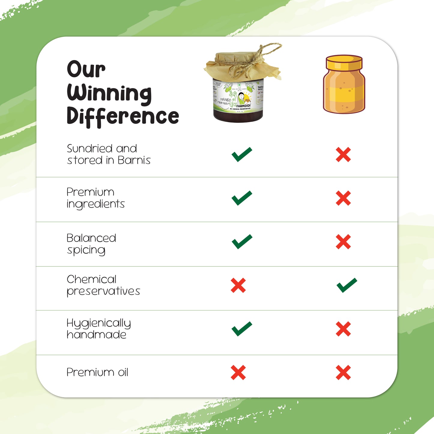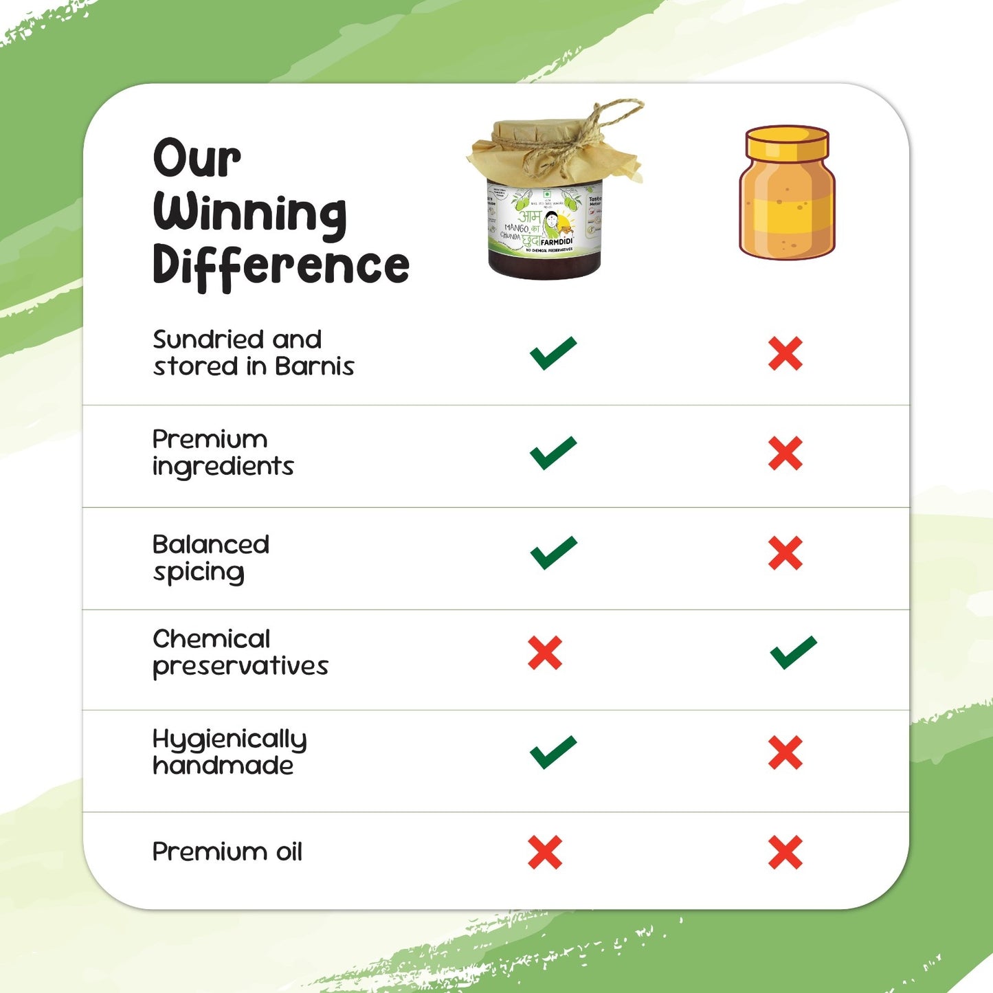 | Key Ingredients | Fennel seeds, Nigella seeds, Asafoetida | Yellow mustard seeds, Fenugreek seeds | Raw mango, Mustard powder, Guntur red chilli | Sugar, Cumin powder, Asafoetida | Jaggery |