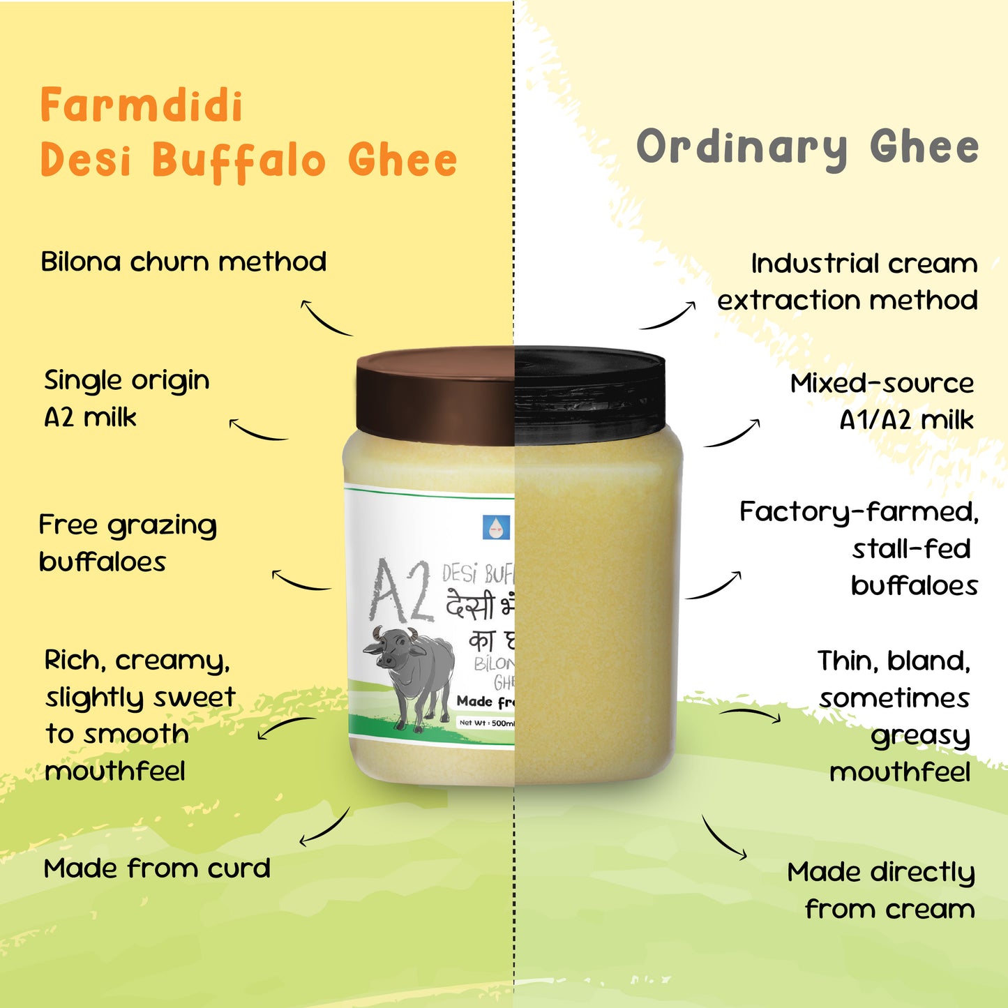 FarmDidi Bilona Buffalo Ghee is made from milk of grass-fed buffaloes nourished on 100% natural, urea- and chemical-free feed, ensuring pure, rich, and nutrient-packed ghee unlike mass-produced alternatives.