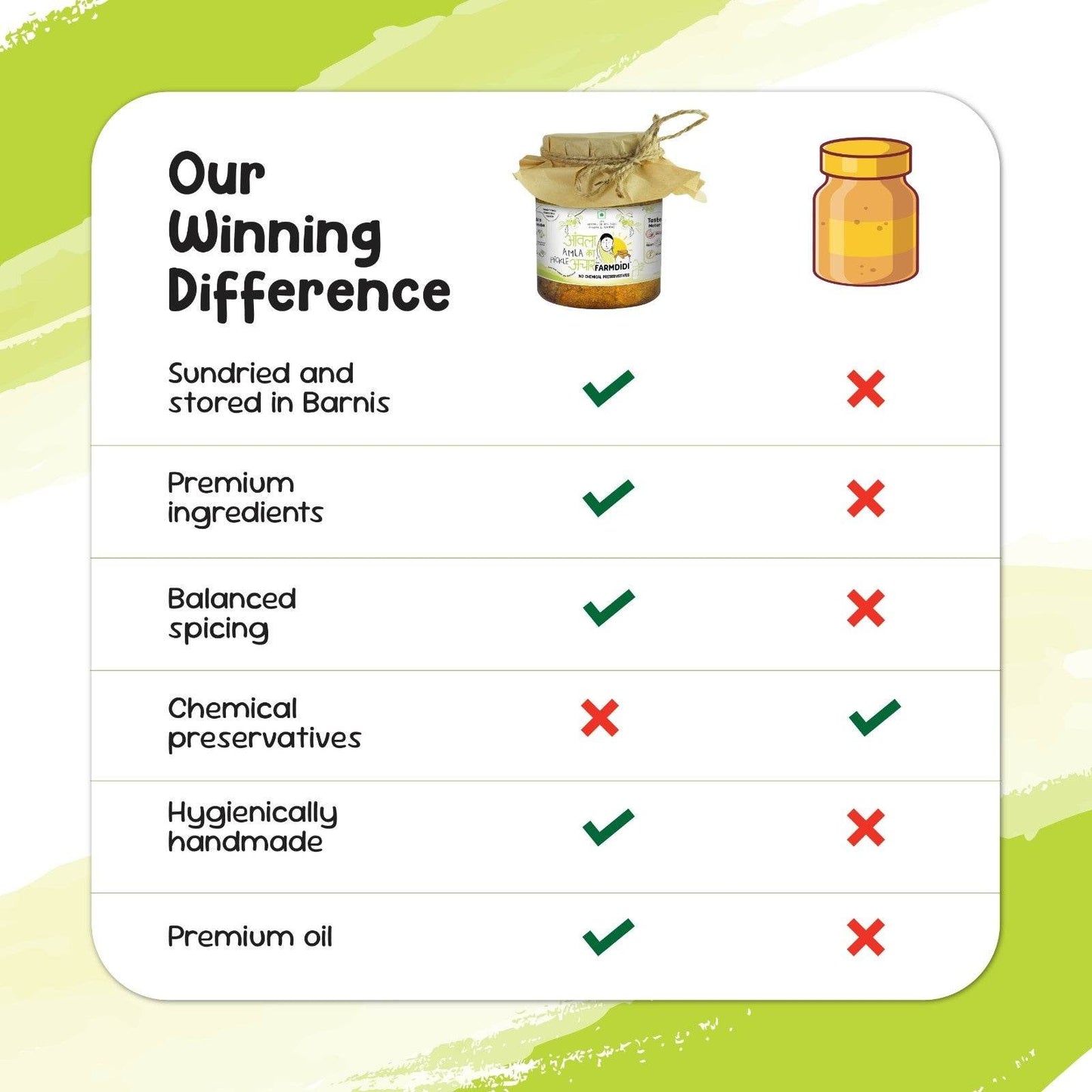 For natural fermentation and developing rich flavour, the pickle is matured in sunlight for 4 days, allowing the spices to blend to perfection. Whether you are pairing it with rice, parathas, or curd, FarmDidi’s Amla Pickle adds a burst of flavour and wellness to every bite. It is all natural and free from artificial colours, flavors, and preservatives.