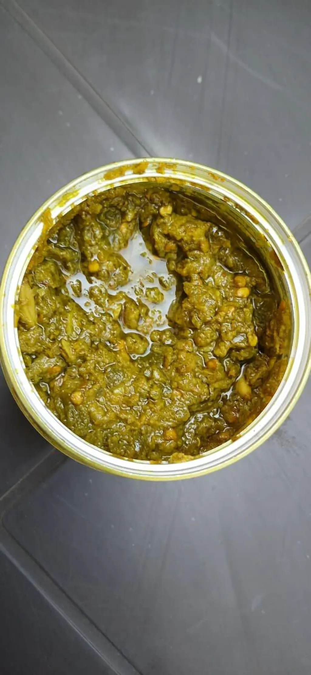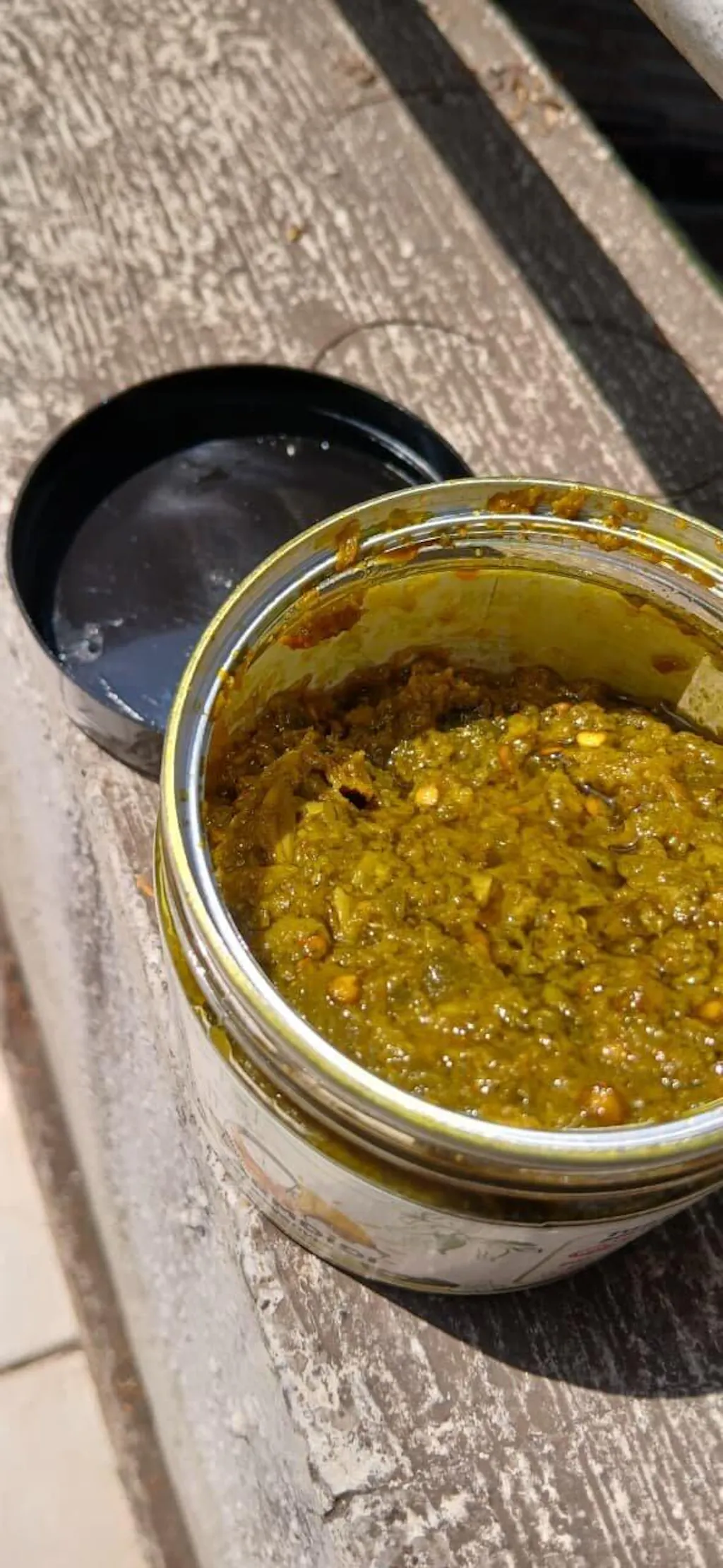 Fresh green chillies are crushed with garlic, spices, and oil, following traditional methods to retain authentic flavor and texture.