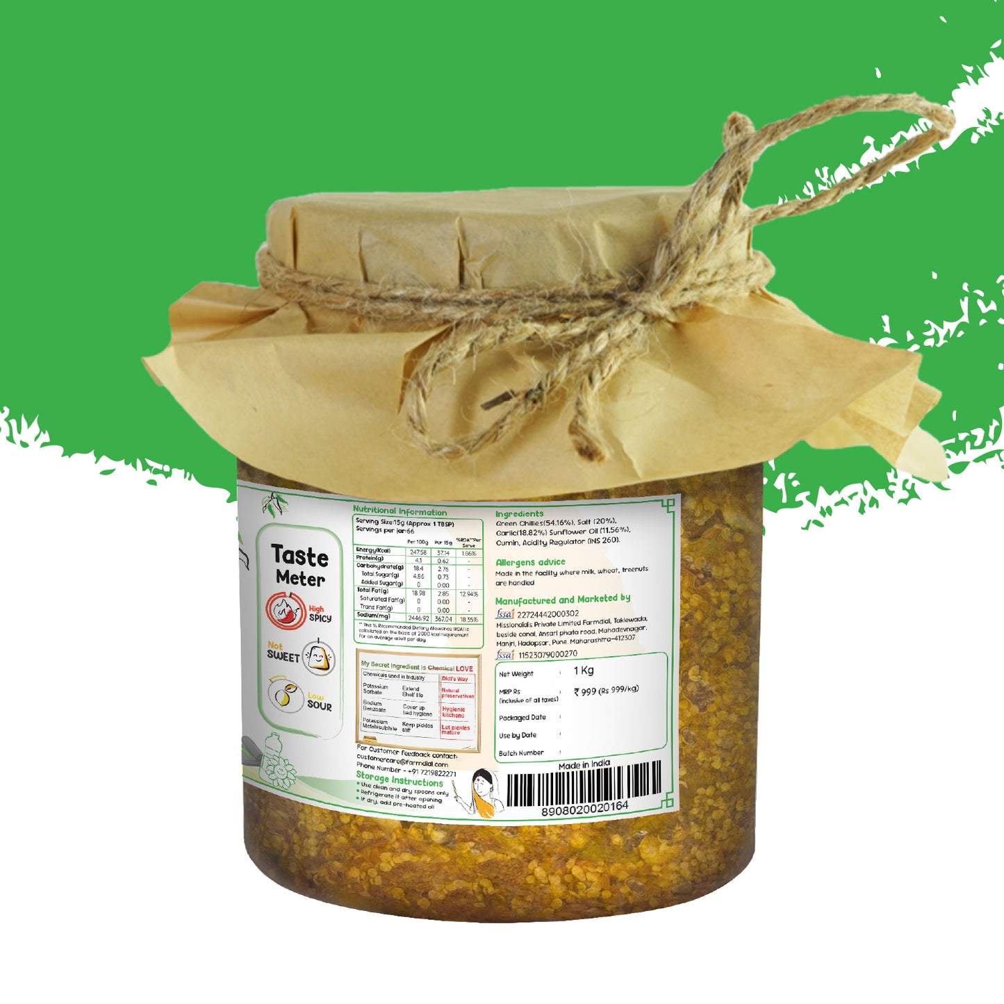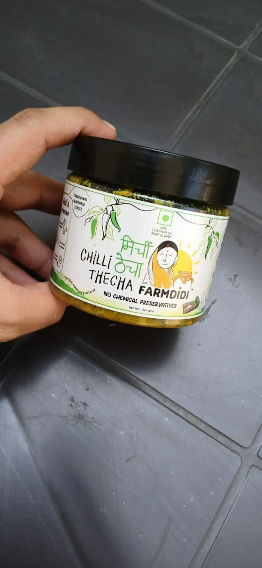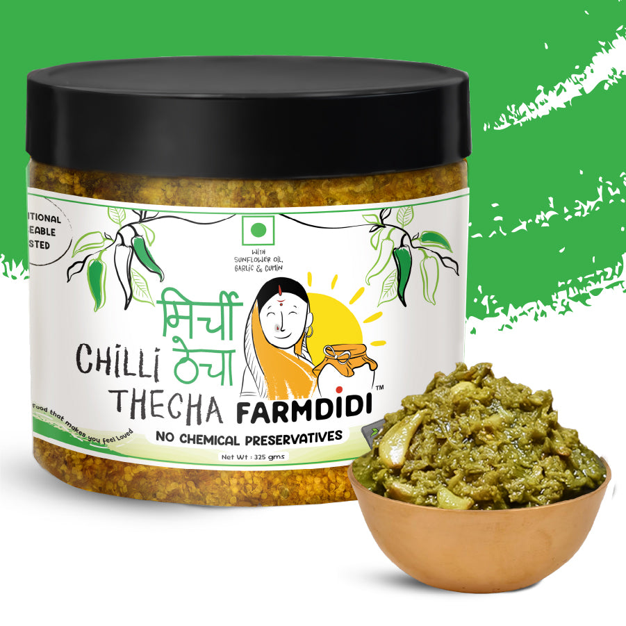 Farmdidi’s Mirchi Thecha is an authentic Maharashtrian thecha chutney made using fresh spicy green chillies, garlic, cumin, and sunflower oil. A staple of traditional Maharashtrian cuisine, this bold and fiery condiment is loved for its rustic flavour and coarse texture. Traditionally, thecha is prepared by crushing chillies and garlic on a silbatta (stone grinder), a method that releases deeper aromas and creates its signature coarse texture, just like the homemade thecha found in rural Maharashtrian kitchens.