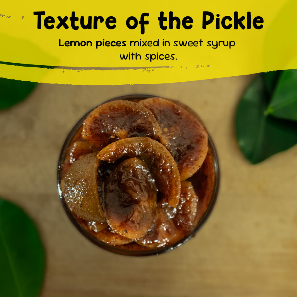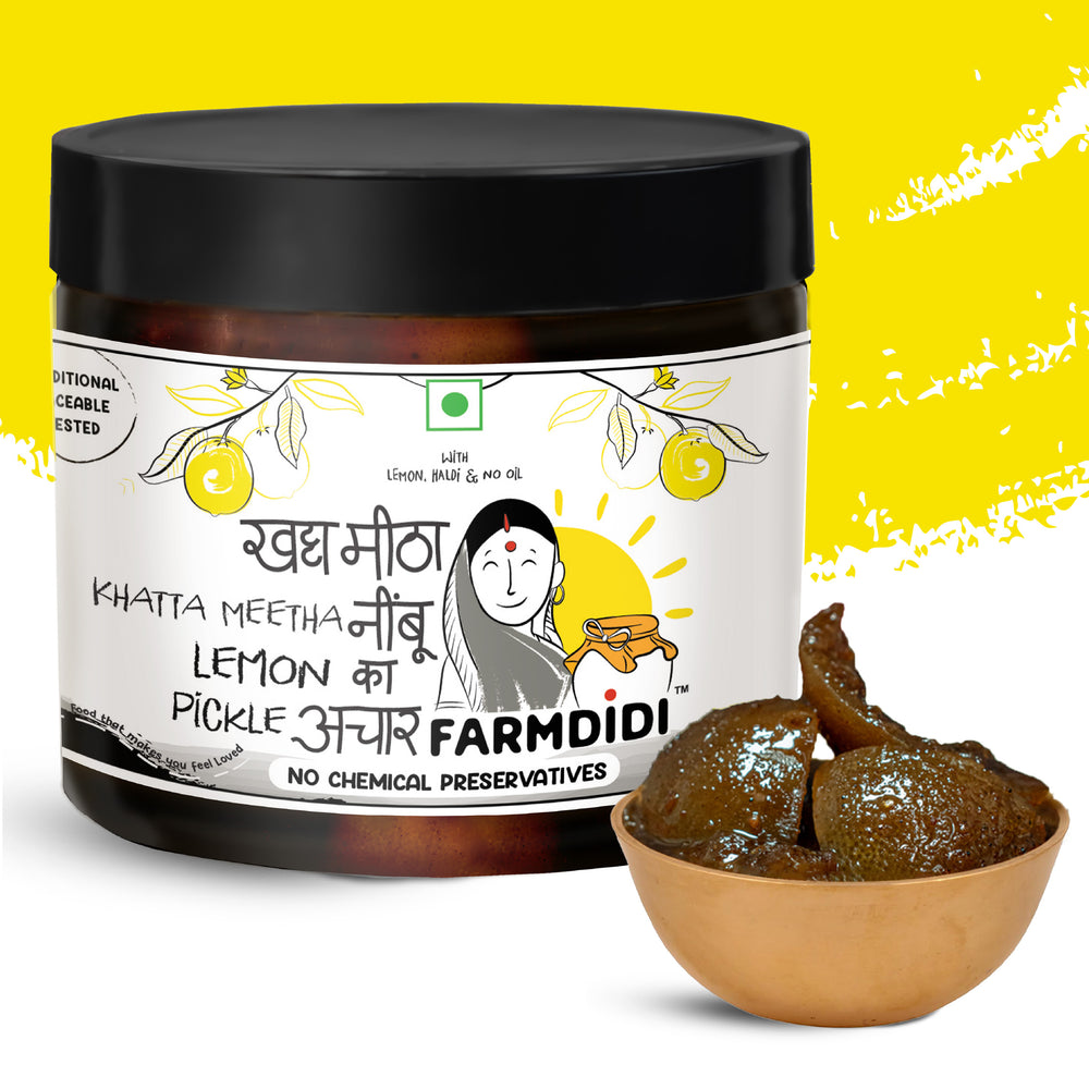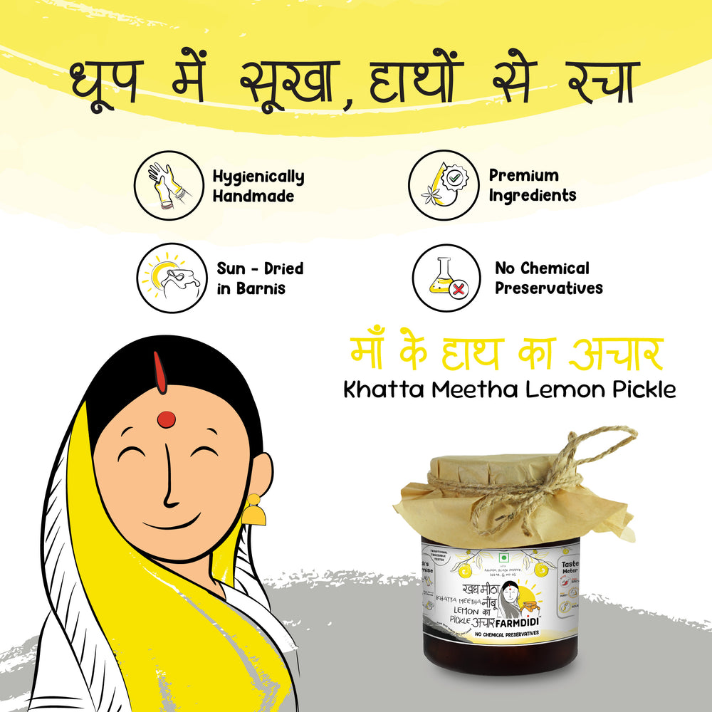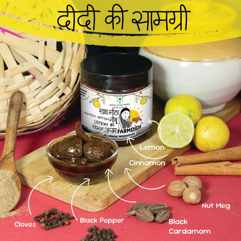 Our sweet and tangy Black Lemon Pickle is a delightful blend of flavour, which is made by Gauri didi from Vir village.