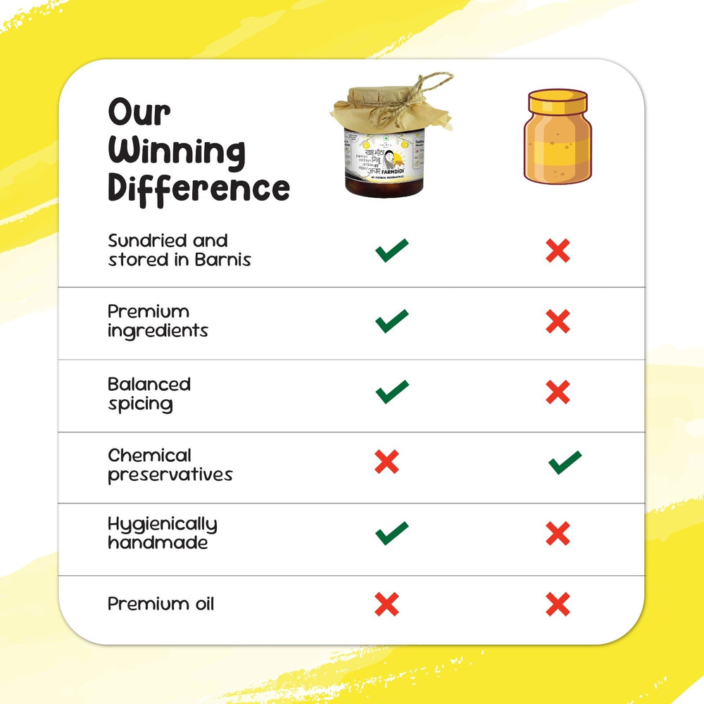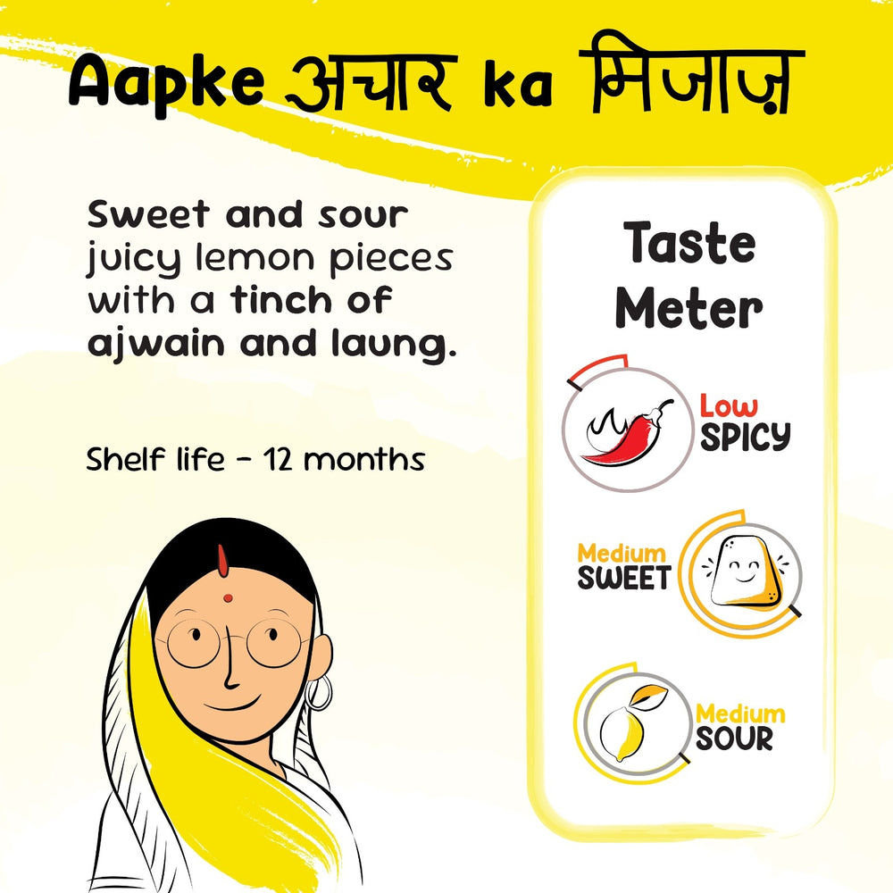Our Nimbu ka achar is made with the finest yellow kagzi lemons, which are handpicked, washed, and dried while ensuring hygiene. The lemon is cut into 4 pieces, and the seeds are removed. A perfect blend of salt, sugar, with a premium spice mix is added to develop a rich flavour. The masala and ajwain are used to enhance its flavour profile and add a kick to it.