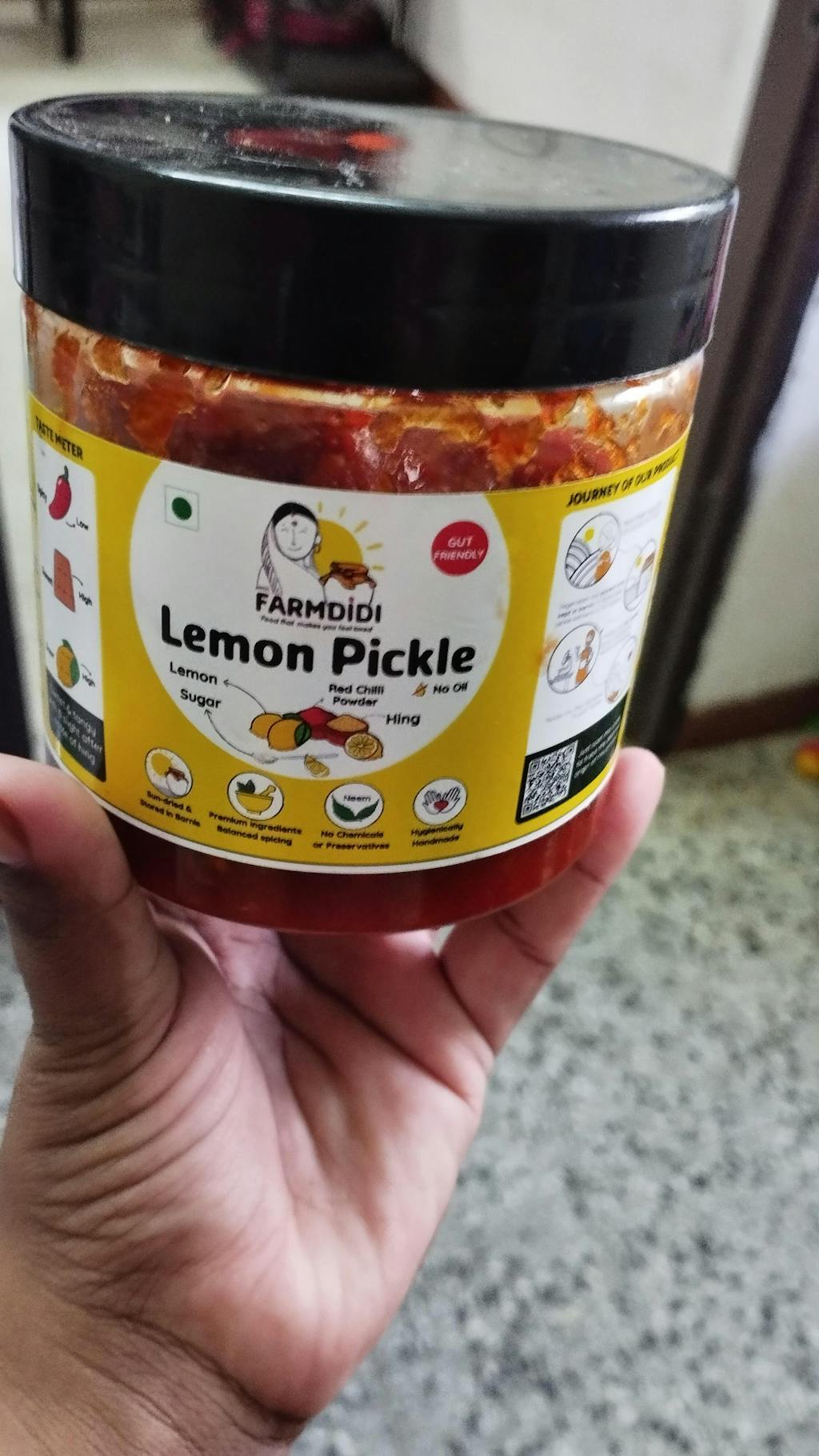 The lemons are carefully selected to ensure quality, then the lemons are washed and dried. Each lemon is cut into four pieces, the seeds are removed and the lemons are crushed. A flavourful mix of salt, sugar and a premium spice mix is added to the crushed lemons with a hint of hing which is added to enhance its depth and aroma. The lemon pickle is then matured for 5-7 days, allowing the flavours to develop a well rounded taste.