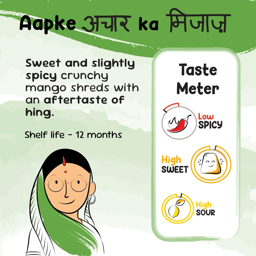 Our Aam ki launji (aam ka chutney) is made by using high quality handpicked Totopuri Mangoes, which are grated and then cooked with sugar and a premium blend of spices and condiments to achieve a perfect balance of flavours.