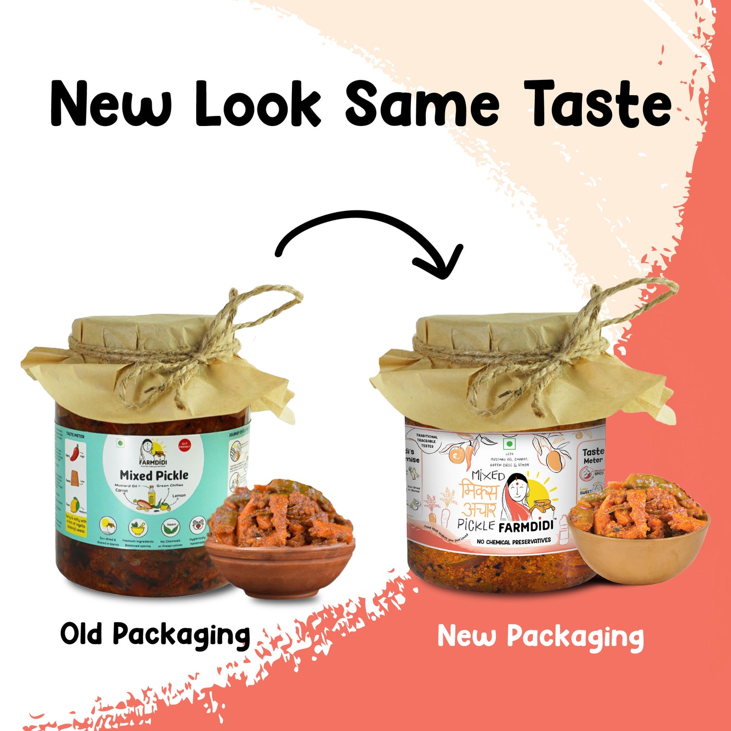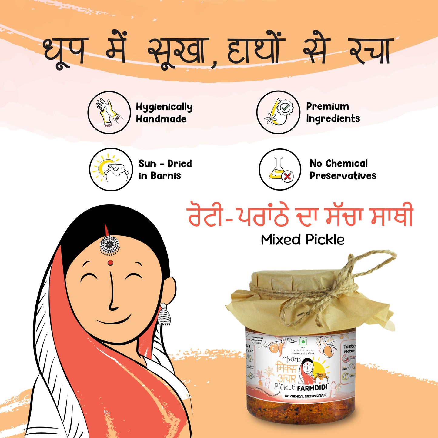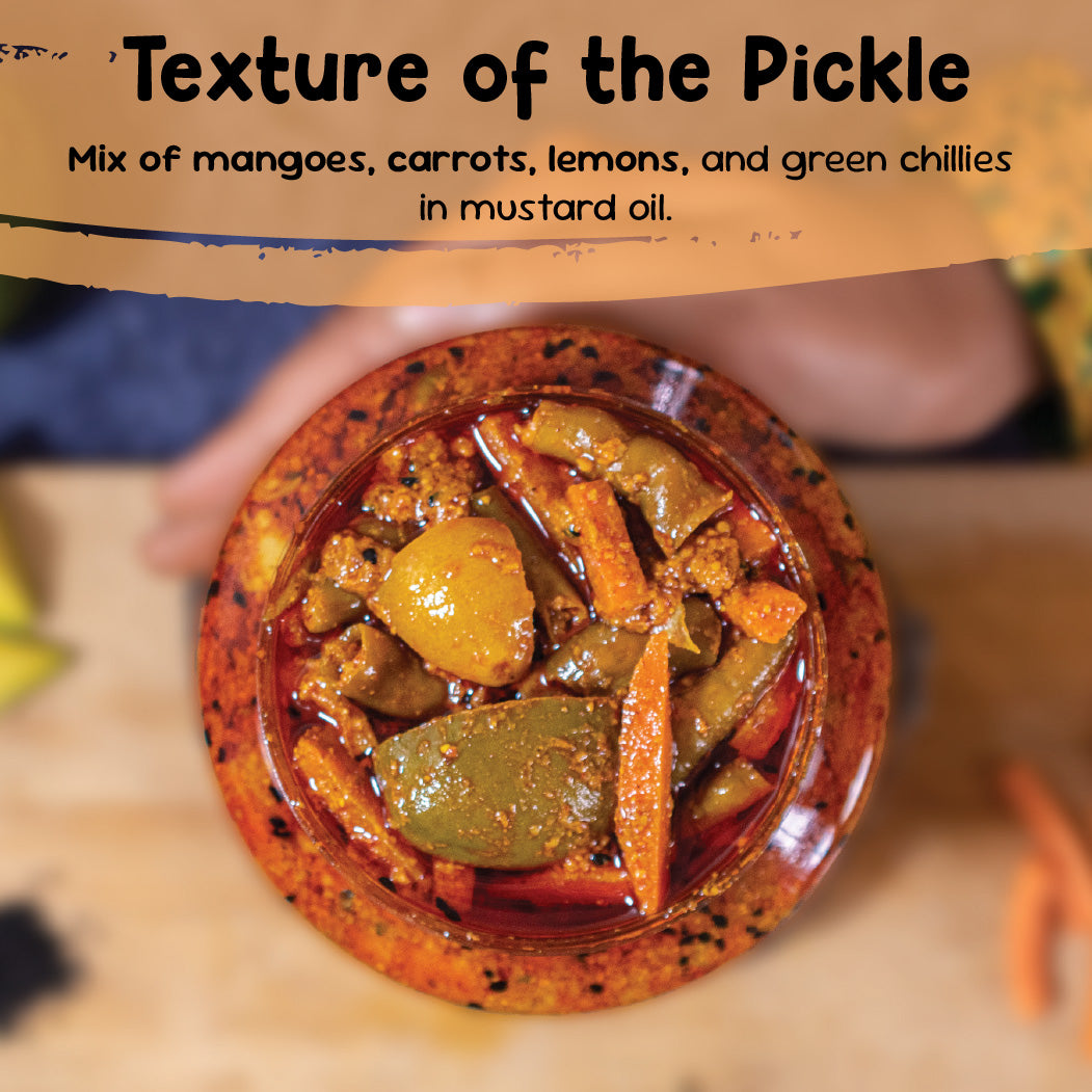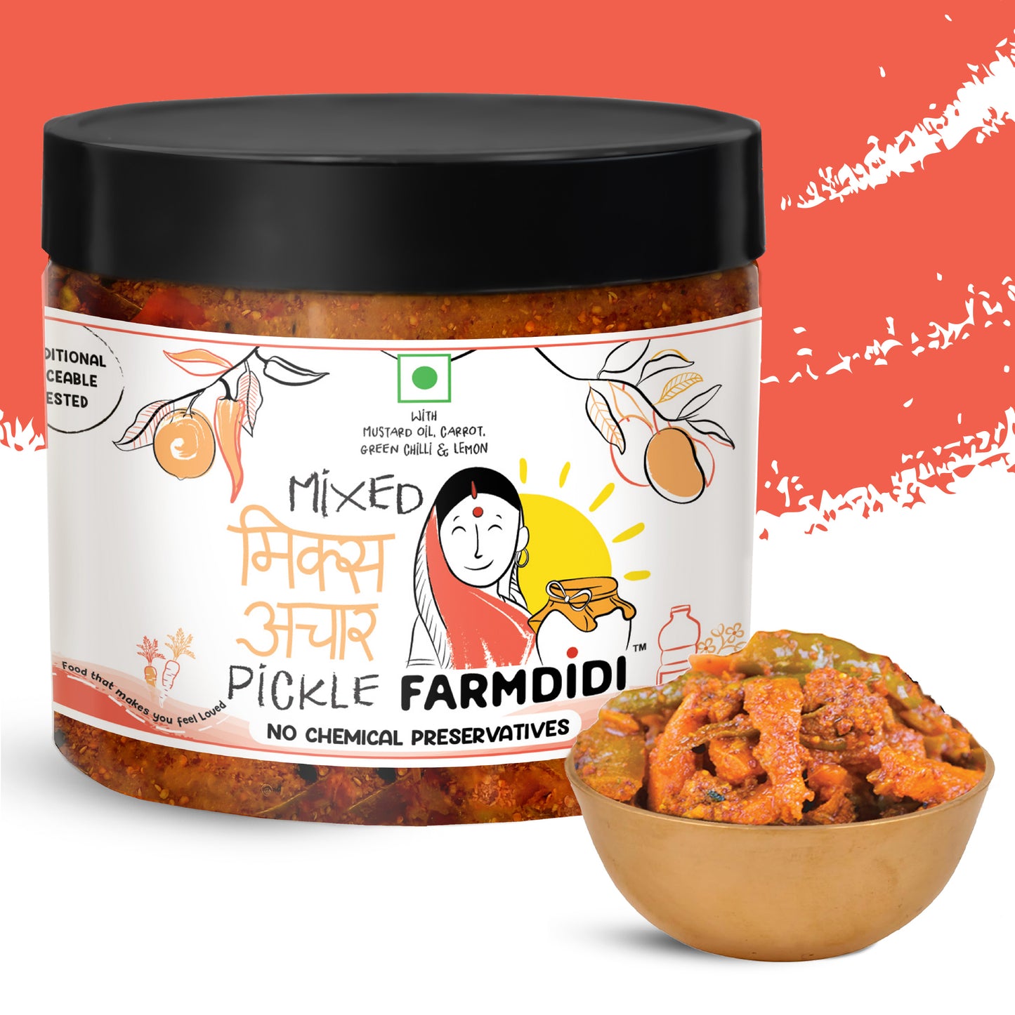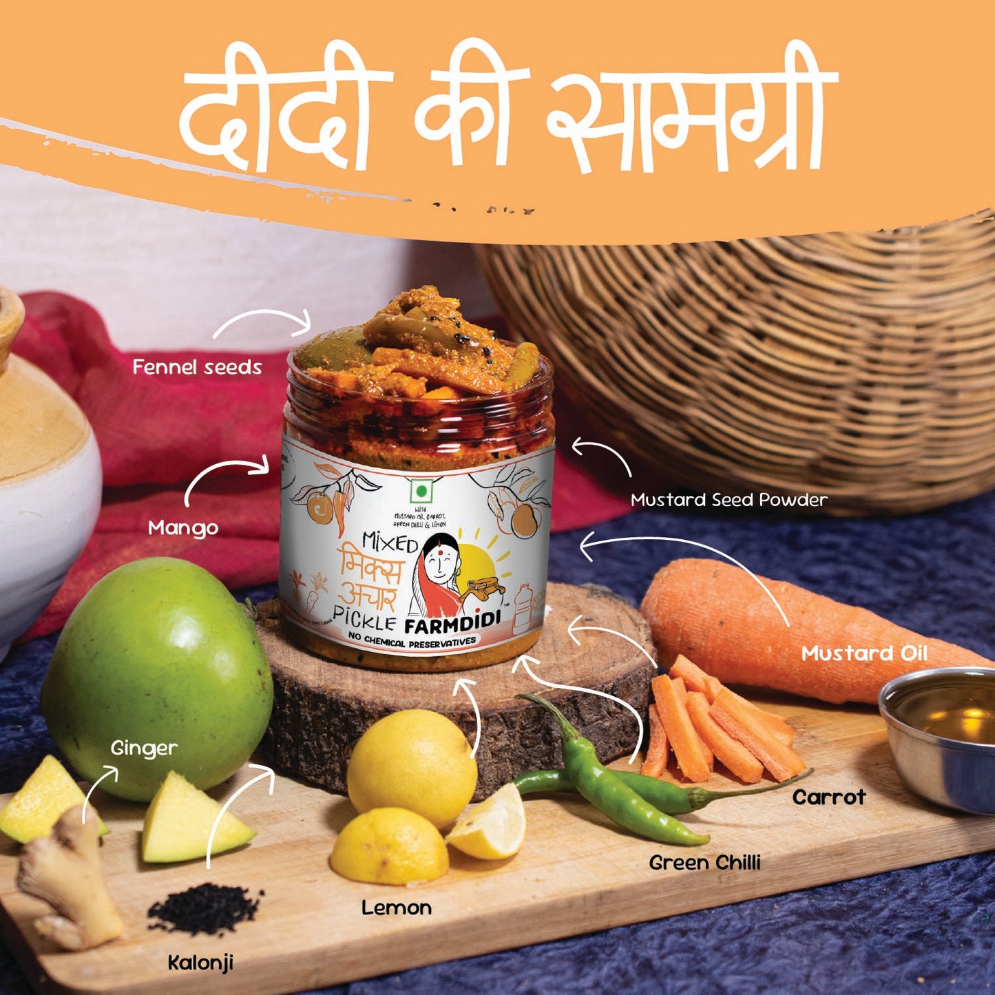 Farmdidi's Mixed Pickle (mixed vegetable ka achar) is a burst of flavors made with the goodness of five fresh vegetables: carrot, raw mango, ginger, lemon, and green chilies (hari mirch). Each ingredient is carefully cut by hand to ensure the perfect texture and balance.