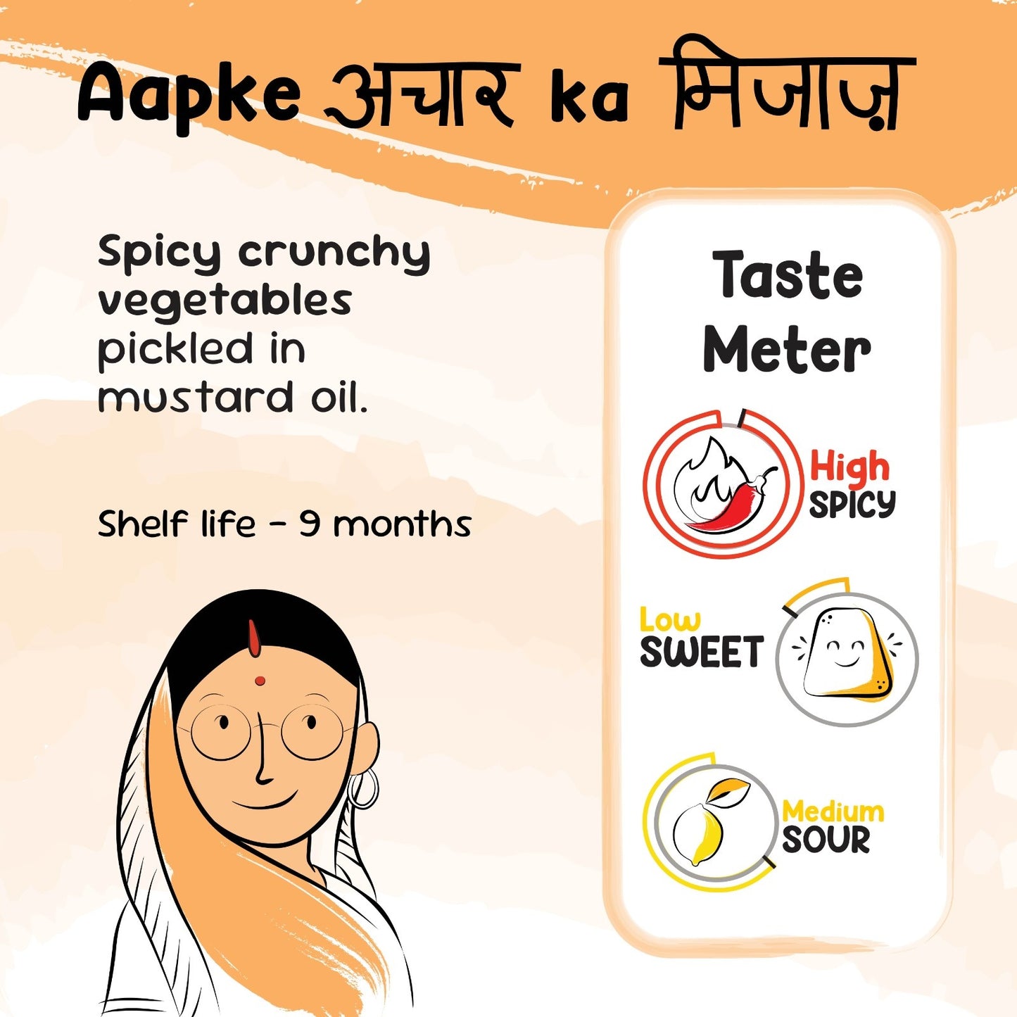 If you're looking for a flavorful, tangy, and slightly spicy pickle, this mixed vegetable ka achar is the best choice. Don’t forget to try our other spicy and mustard oil pickles.