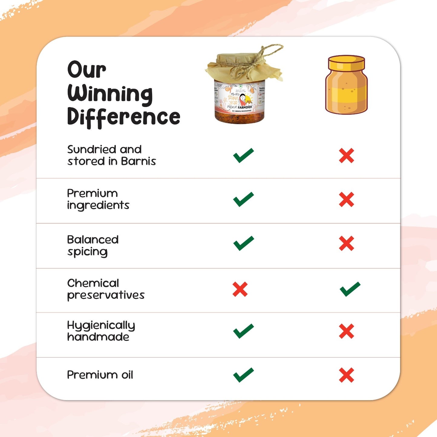 As the pickle matures in sterilized Barnis (ceramic jars),the masala thickens, enriching the flavors and creating the ultimate homemade pickle experience.