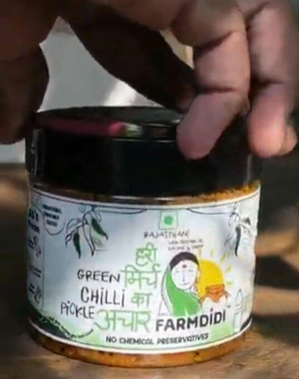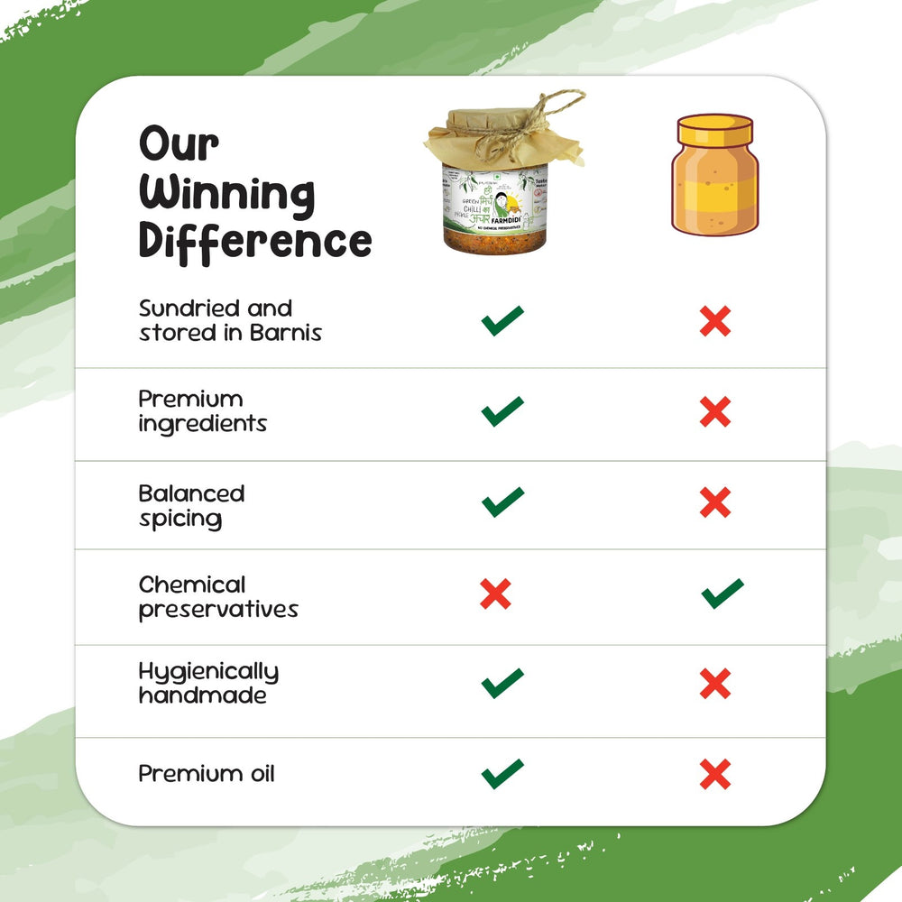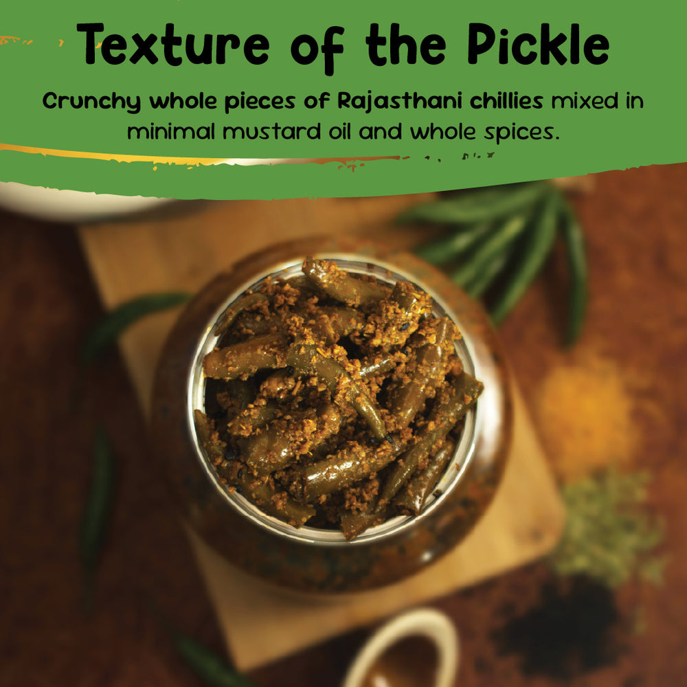 This pickle is made using dark green chillies that are sourced from local farmers. The