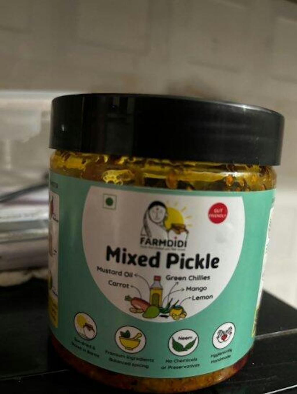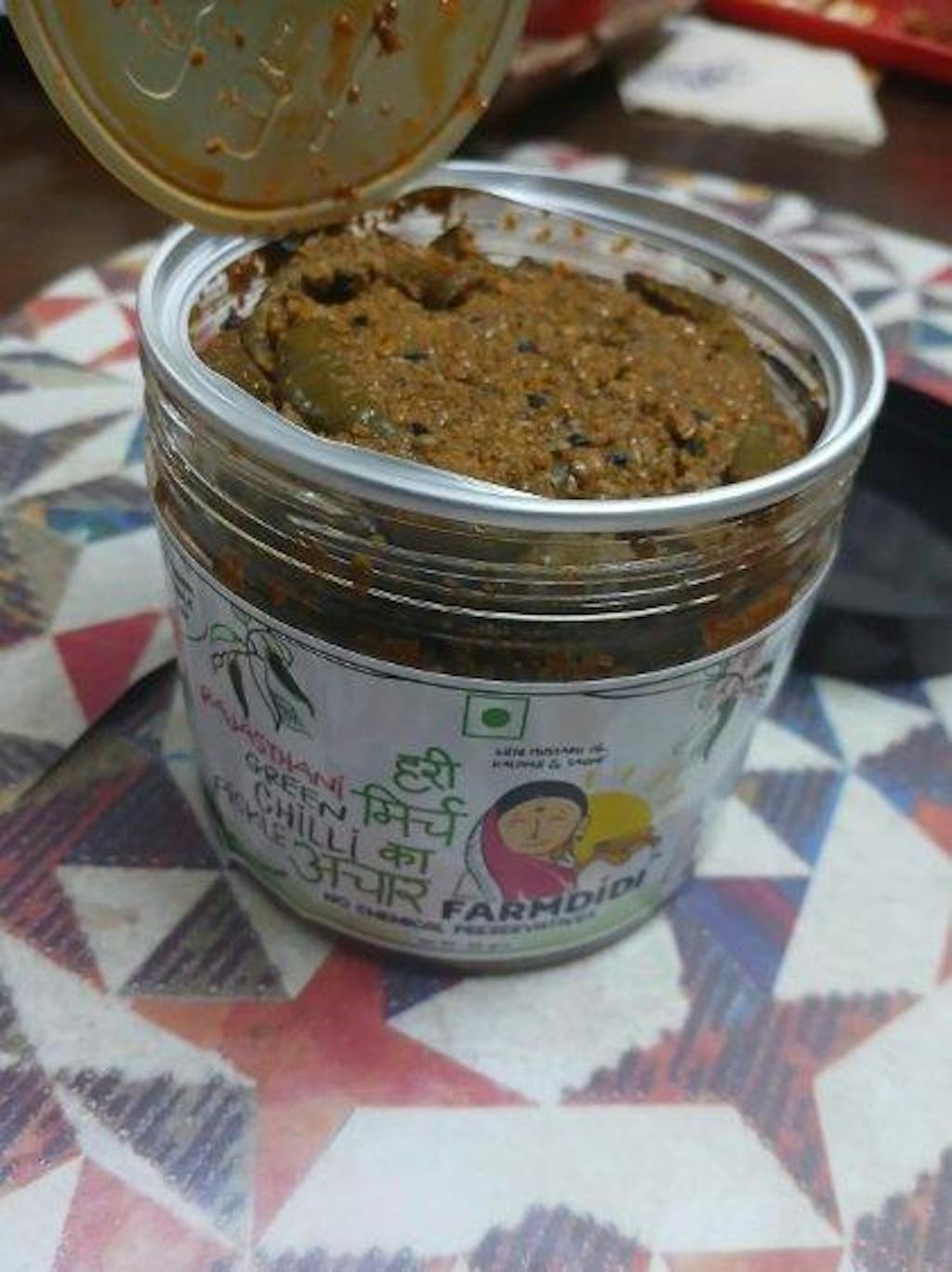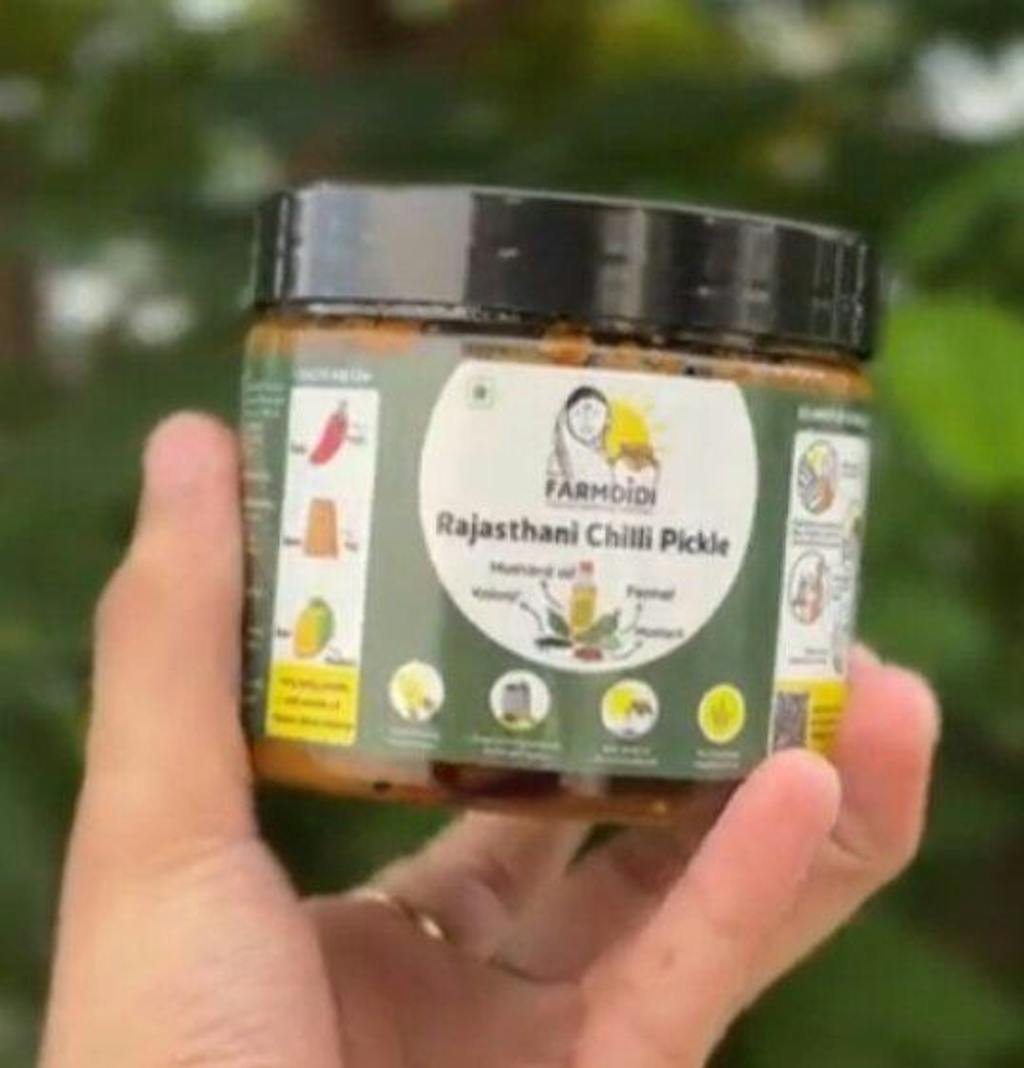 This pickle is made using dark green chillies that are sourced from local farmers. The