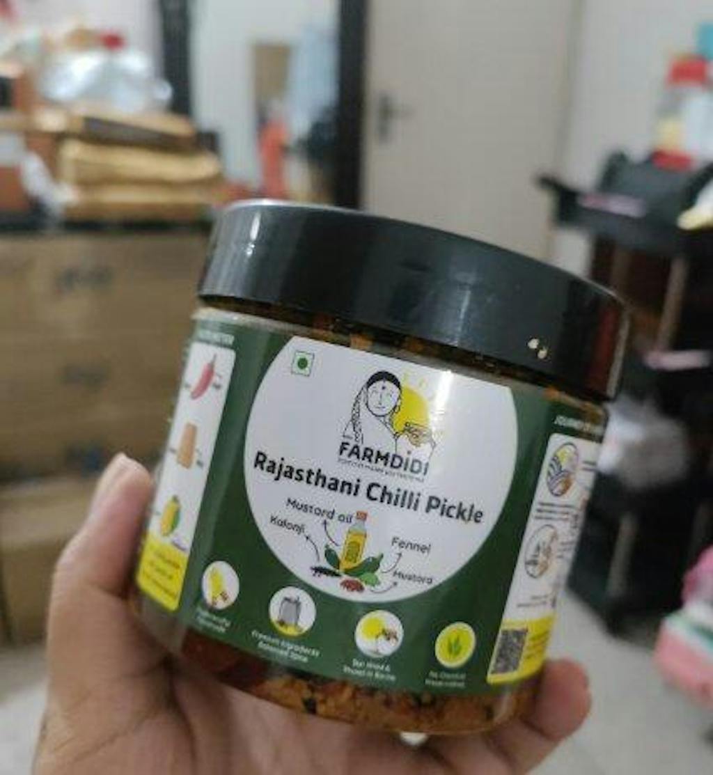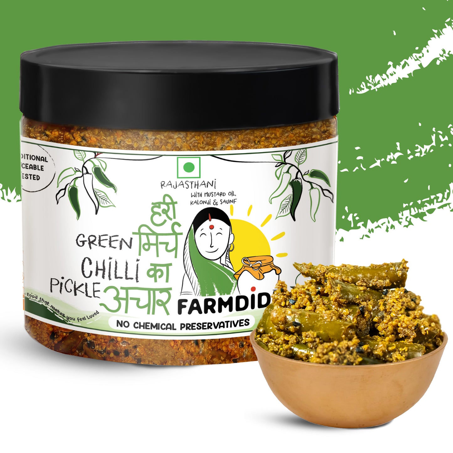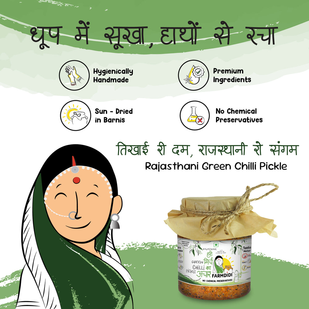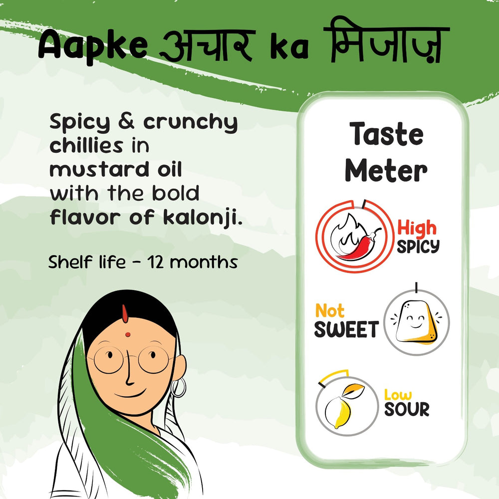 Our Rajasthani Green Chilli Pickle (Green Chili Achar) is a flavourful blend of heat and aromatic spices made by Rubaida didi from Uruli Kanchan.
