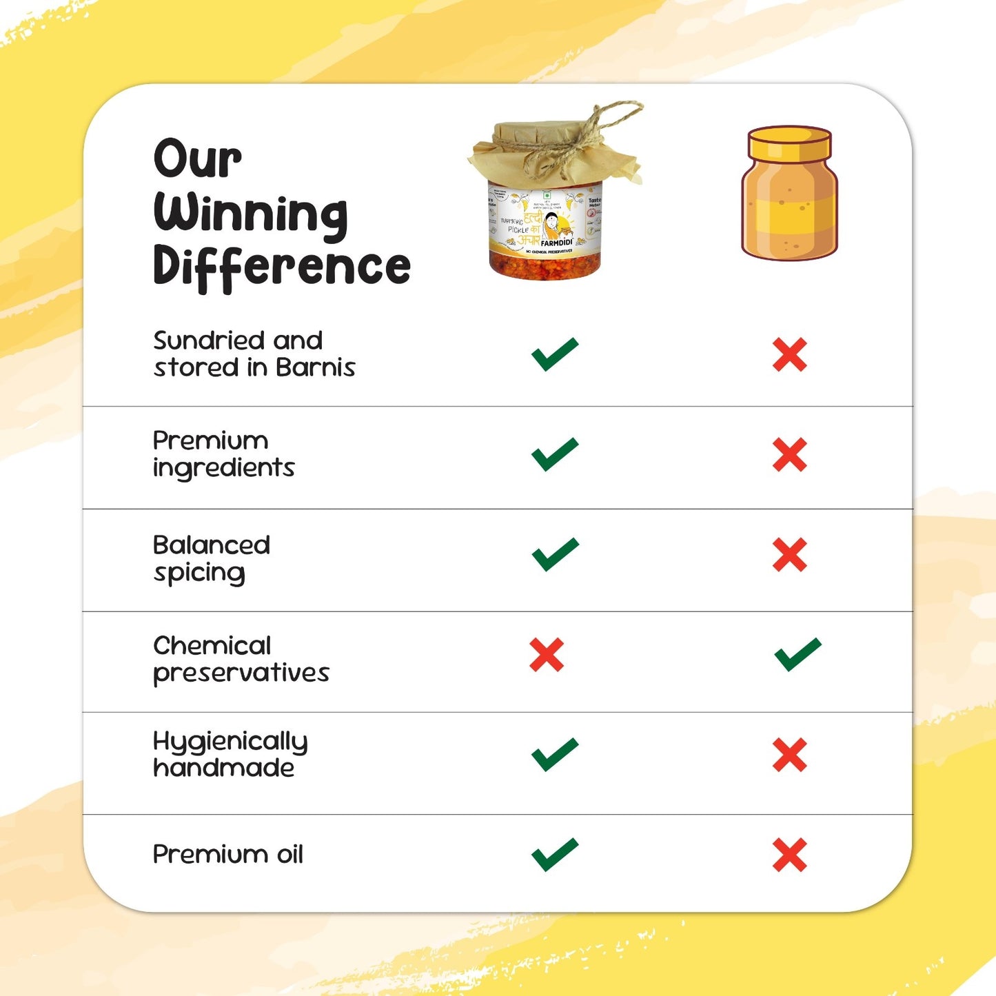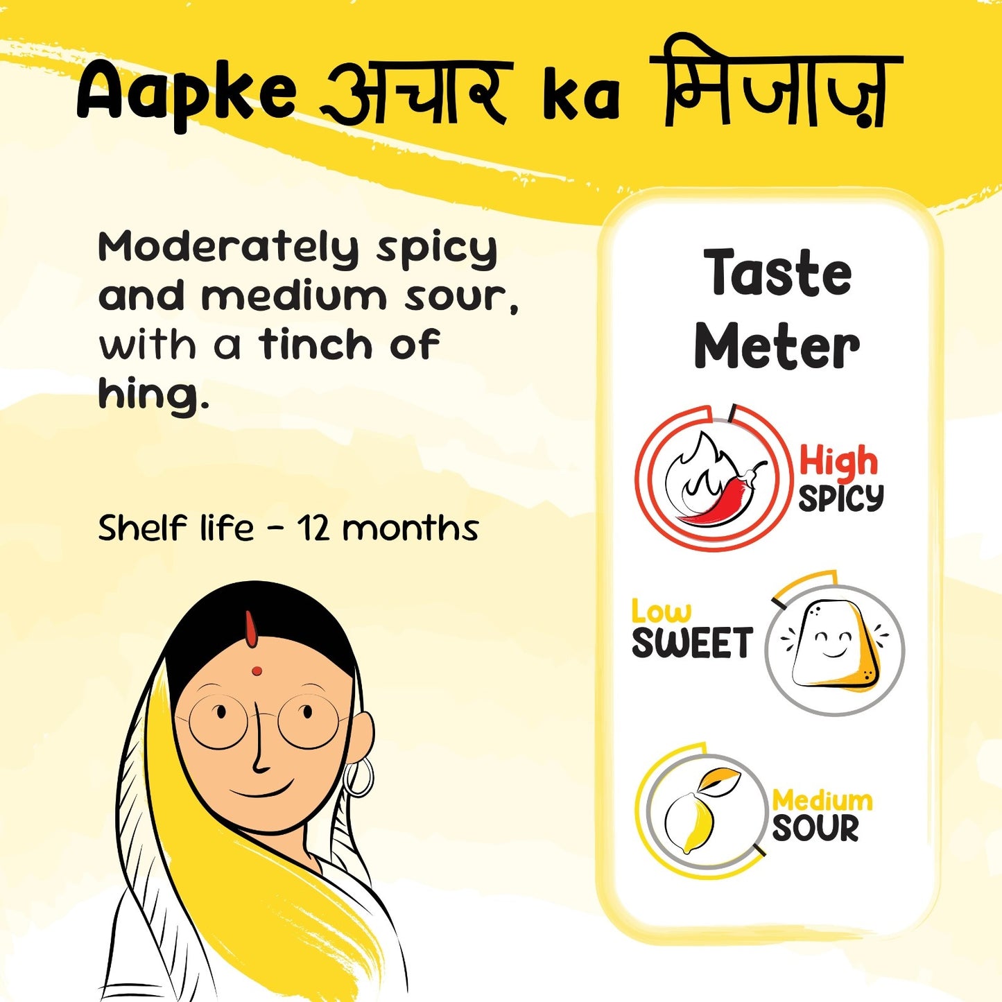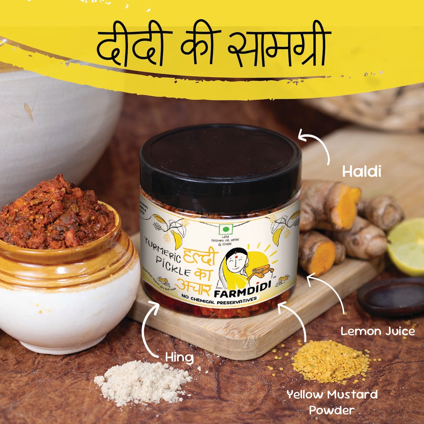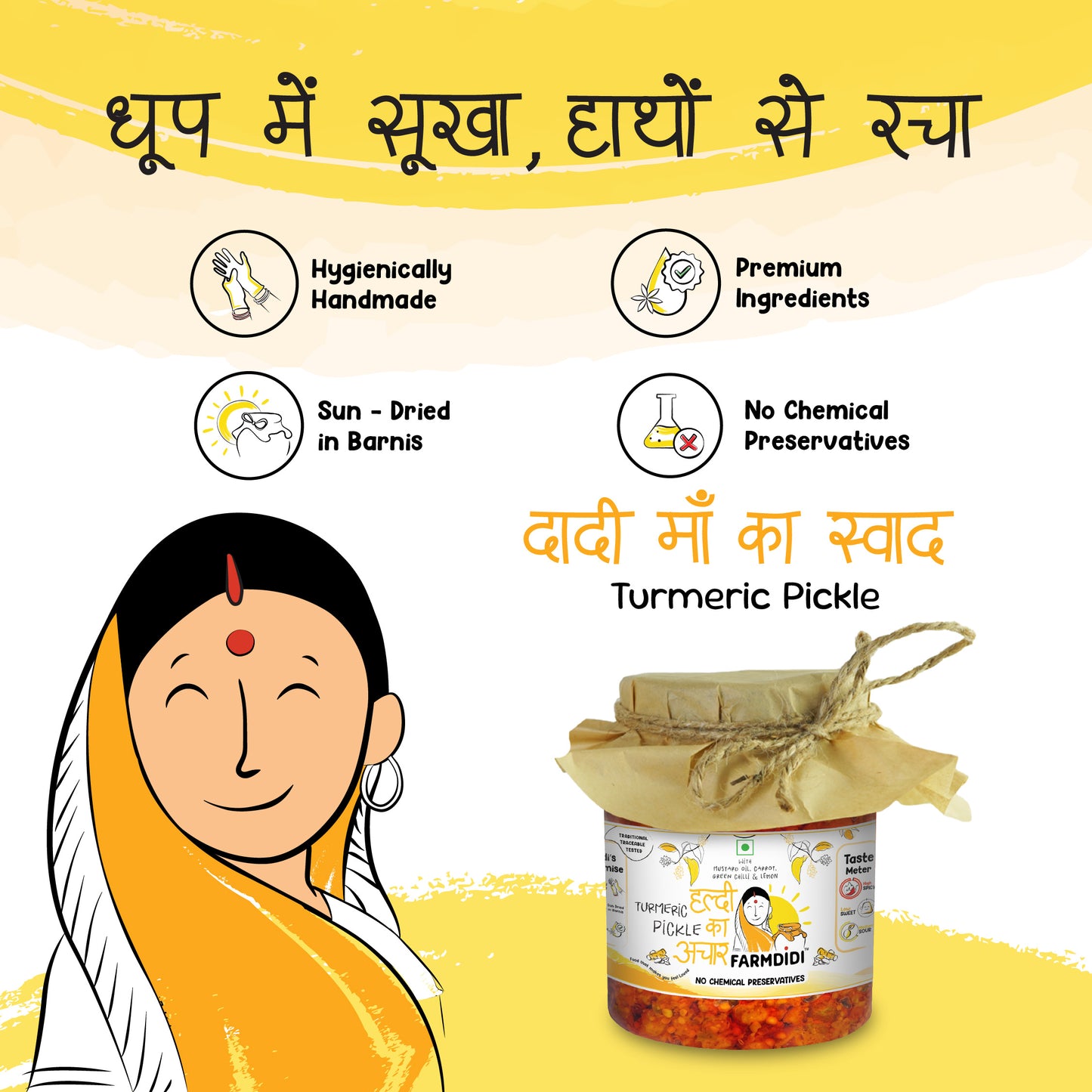 According to our Farmer Didis, this pickle gives you the optimal level of nutrients and spices required to complete your wholesome meal. It is also called hald lonche /amba halad in Maharashtra, and it is loved by fans of Marwari achar, Rajasthani pickle, Punjabi haldi achar too.