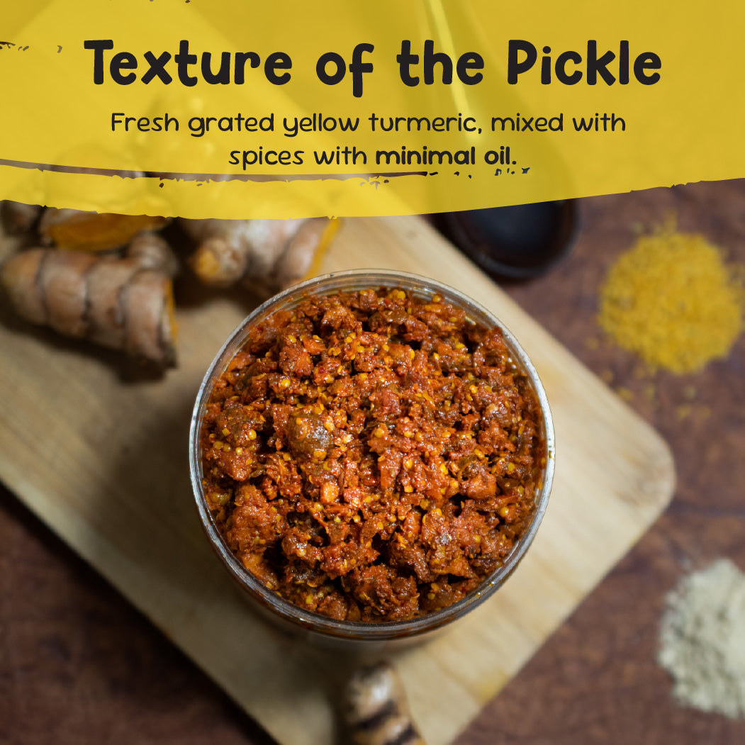 Our Haldi Ka Achar brings together the bold, earthy flavour of fresh turmeric with a flavourful blend of traditional spices. This traditional turmeric pickle (kacchi haldi achar) is made using mustard dal, lemon juice, asafoetida, cumin, fenugreek, red chilli powder, and salt for a well-rounded, vibrant taste.